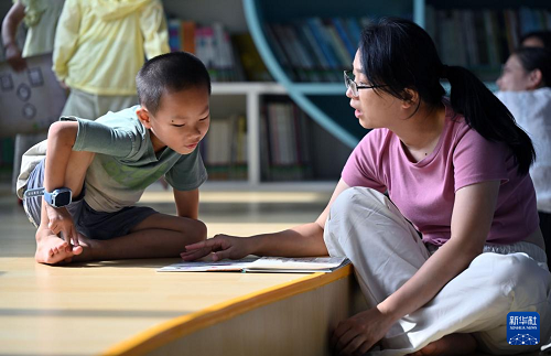 8月3日,家長(zhǎng)帶著孩子在位于海口市的海南省圖書館讀書。(新華社記者 郭程 攝)