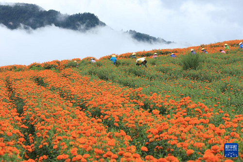 8月7日,在云南騰沖市固?hào)|鎮(zhèn),農(nóng)民采收萬(wàn)壽菊。(新華社發(fā) 龔祖金 攝)