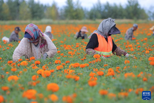 8月7日,在黑龍江省佳木斯市富錦市一處萬(wàn)壽菊種植基地,村民采摘萬(wàn)壽菊。(新華社發(fā) 曲玉寶 攝)