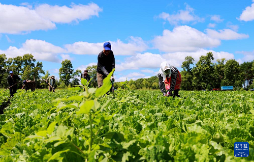 8月7日,在北大荒集團(tuán)黑龍江紅星農(nóng)場(chǎng)有機(jī)白菜田地里,工人開(kāi)展除草作業(yè)。(新華社發(fā) 侯越攝)
