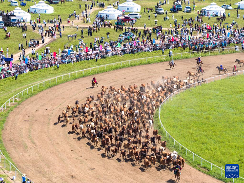 8月7日,游客在農(nóng)牧民那達慕大會上觀看跑馬表演(無人機照片)。(新華社記者 馬金瑞 攝)