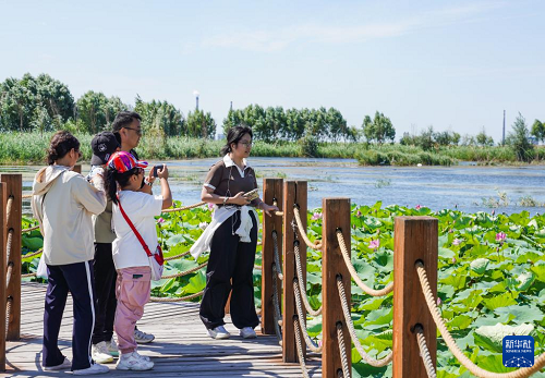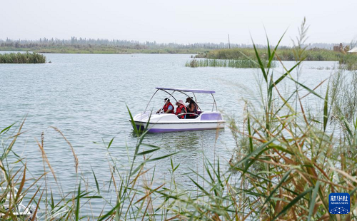 8月10日,游客在瑪納斯國(guó)家濕地公園游玩。(新華社記者 周佳誼 攝)