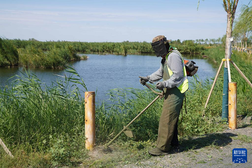 8月10日,工作人員在瑪納斯國(guó)家濕地公園清除雜草。(新華社記者 周佳誼 攝)