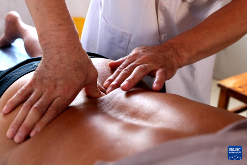 8月18日,在山東省臨沂市平邑縣溫水鎮(zhèn)衛(wèi)生院,中醫(yī)師為患者正骨推拿。(新華社發(fā) 武紀全 攝)