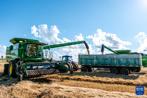 8月20日,呼倫貝爾農(nóng)墾拉布大林農(nóng)場的工人駕駛農(nóng)機(jī)將收獲的小麥裝車。(新華社記者 馬金瑞 攝)