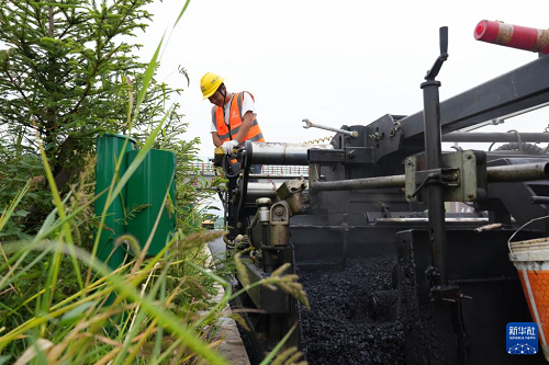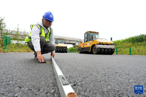 8月28日,技術(shù)人員在監(jiān)測瀝青攤鋪平整度。(新華社記者 王松 攝)