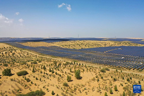 近年來,內(nèi)蒙古開展防沙治沙與風(fēng)電光伏一體化工程,推進庫布其沙漠治理。目前,在鄂爾多斯市杭錦旗等庫布其沙漠北部地區(qū),一片片光伏基地在促進新能源產(chǎn)業(yè)發(fā)展的同時,成為當?shù)厣鷳B(tài)治理、經(jīng)濟發(fā)展的堅實屏障?!肮夥?生態(tài)治理”建設(shè)模式實現(xiàn)板上發(fā)電,板間、板下統(tǒng)籌兼顧特色生態(tài)修復(fù)、經(jīng)濟作物、造林綠化與技術(shù)創(chuàng)新,打造立體生態(tài)修復(fù)模式,讓沙海變成綠色電能涌動的“藍?!?,實現(xiàn)生態(tài)效益與經(jīng)濟效益共贏。