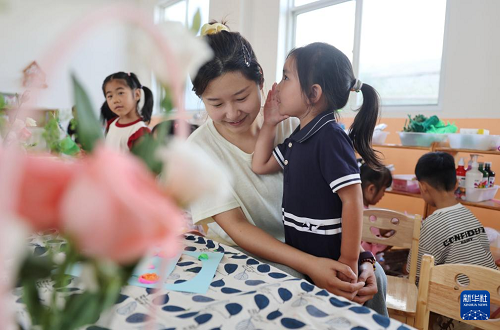 9月9日,在山東省臨沂市沂南縣銅井鎮(zhèn)中心幼兒園,小朋友在跟老師分享節(jié)日祝福悄悄話。(新華社發(fā) 王彥冰 攝)