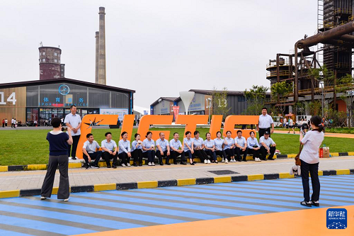 9月10日,工作人員在北京首鋼園與一處服貿(mào)會英文標識合影。(新華社記者 徐欽 攝)