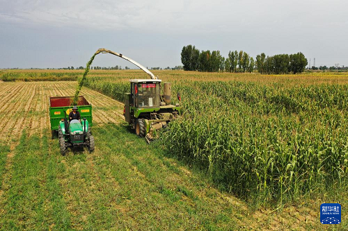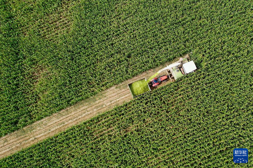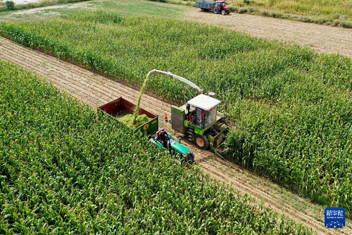 9月11日,農(nóng)機(jī)手操作農(nóng)機(jī)在杭錦旗吉日嘎朗圖鎮(zhèn)格更召嘎查田間收割青貯玉米(無人機(jī)照片)。(新華社記者 李志鵬 攝)