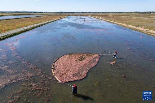 9月21日,在撫遠(yuǎn)市蔓越莓種植基地,工作人員在采收蔓越莓。(新華社記者 張濤 攝)