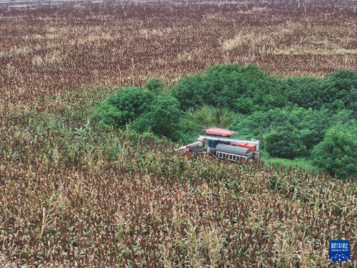 9月21日,收割機(jī)在地里收割高粱(無人機(jī)照片)。(新華社記者 季春鵬 攝)