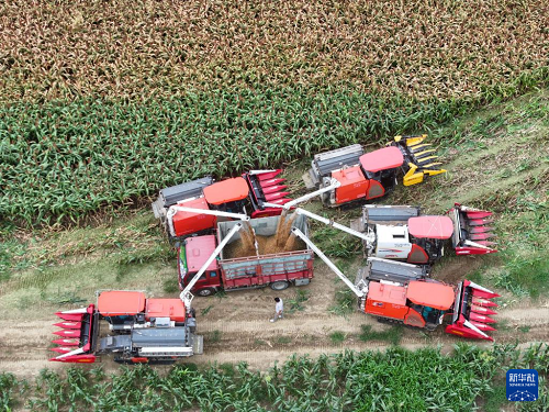 9月21日,收割機(jī)卸下收割的高粱(無人機(jī)照片)。(新華社記者 季春鵬 攝)