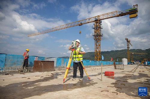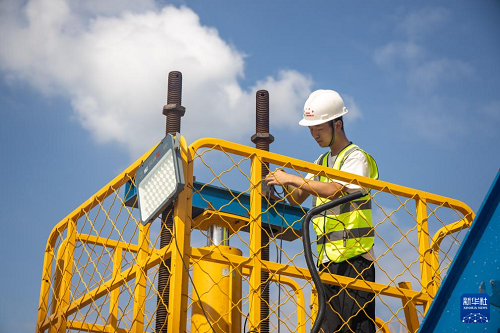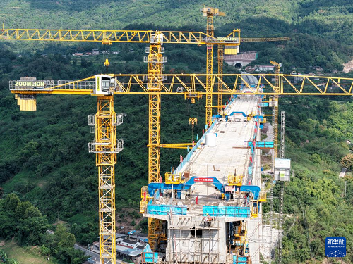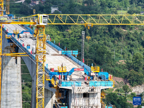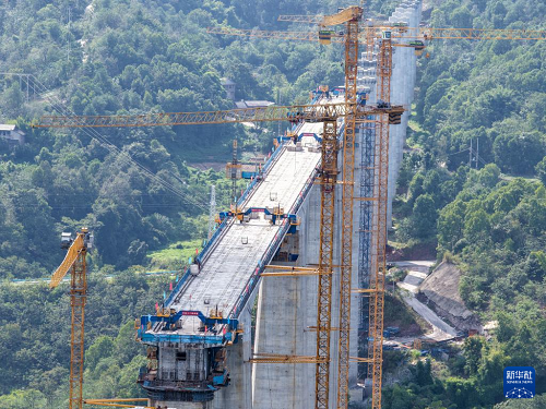 9月24日,工人在渝萬高鐵五步河雙線特大橋建設現(xiàn)場施工作業(yè)。(新華社記者 唐奕 攝)
