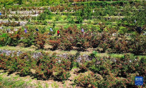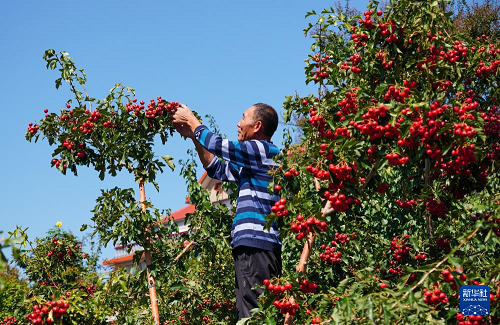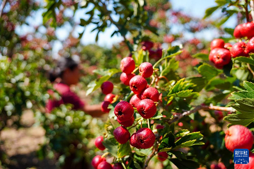 9月25日,在新泰市劉杜鎮(zhèn),果農(nóng)在采摘山楂。(新華社記者 徐速繪 攝)