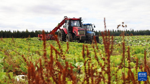 10月8日,在北大荒集團黑龍江紅星農場第四管理區(qū),農機在收獲白菜。(新華社發(fā) 侯越 攝)