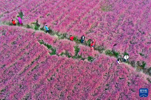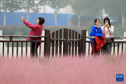 10月8日,游客在河南省許昌市清潩河畔粉黛亂子草園游玩拍照。(新華社發(fā) 牛書培 攝)
