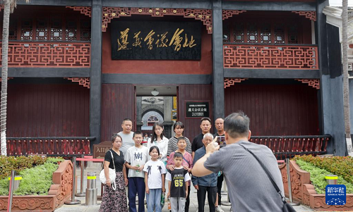 10月8日,游客在貴州省遵義市遵義會(huì)議會(huì)址合影留念。(新華社發(fā) 袁福洪 攝)