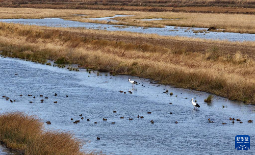 10月14日在黑龍江省同江市三江口國家濕地公園拍攝的東方白鸛和野鴨(無人機(jī)照片)。(新華社發(fā) 劉萬平 攝)