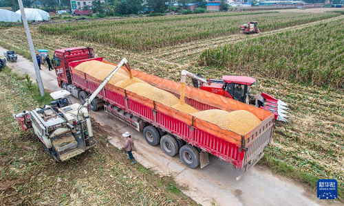 10月14日,在河南省商丘市夏邑縣會亭鎮(zhèn),收割機將收獲的玉米裝車(無人機照片)。(新華社發(fā) 王高超 攝)