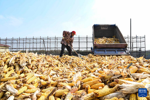 10月14日,河南省濟源市五龍口鎮(zhèn)農(nóng)民晾曬剛收獲的玉米。(新華社發(fā) 苗秋鬧 攝)