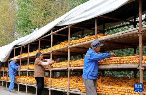 10月14日,在河南省濟源市軹城鎮(zhèn)中王村,村民將收獲的玉米上架晾曬。(新華社發(fā) 段二平 攝)