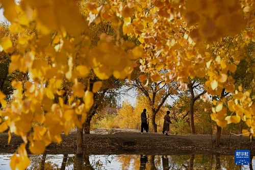 10月14日,游客在甘肅省敦煌市黃渠鎮(zhèn)的胡楊林中游覽。(新華社發(fā) 張曉亮 攝)