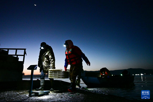 10月18日,庫(kù)區(qū)漁民將一箱剛捕撈的小銀魚上秤稱重。(新華社記者 齊芷玥 攝)