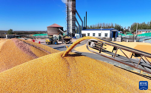10月23日在北大荒集團(tuán)黑龍江尾山農(nóng)場(chǎng)有限公司一烘干企業(yè)拍攝的玉米烘干作業(yè)現(xiàn)場(chǎng)(無(wú)人機(jī)照片)。(新華社發(fā) 陸文祥 攝)