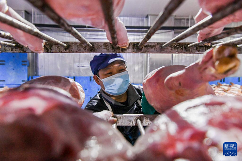 11月6日,在浙江省金華金年火腿有限公司車間內(nèi),技師查看腌制火腿的原料。(新華社發(fā) 時(shí)寬兵 攝)