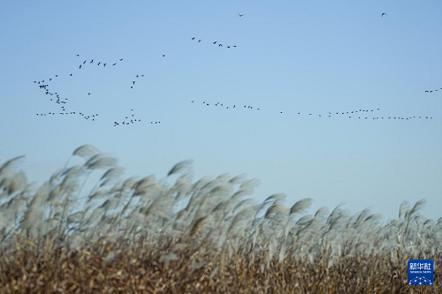 11月13日,在黃河三角洲國(guó)家級(jí)自然保護(hù)區(qū),越冬候鳥在飛翔。(新華社記者 朱崢 攝)