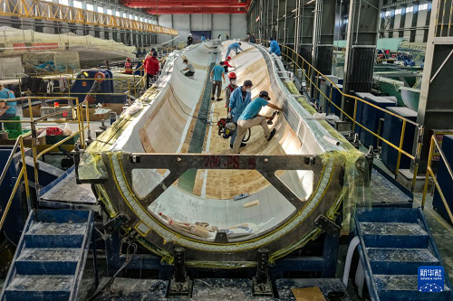 11月20日,在甘肅省酒泉經濟技術開發(fā)區(qū)的甘肅九鼎風電復合材料有限公司成型車間,工作人員進行風機葉片鋪層作業(yè)(無人機照片)。(新華社記者 郎兵兵 攝)