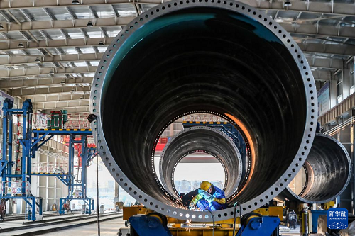11月20日,在甘肅省酒泉經濟技術開發(fā)區(qū)的中國水電四局(酒泉)新能源裝備有限公司塔筒制造車間,工作人員進行風機塔筒焊接作業(yè)。(新華社記者 郎兵兵 攝)