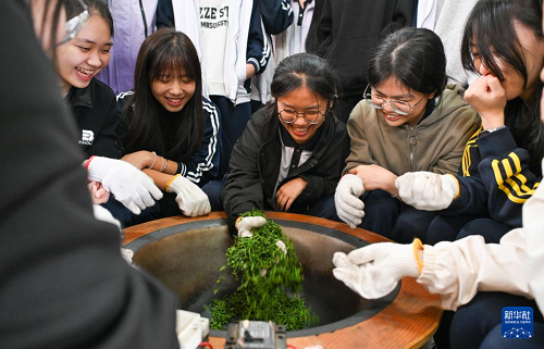 在海南省白沙黎族自治縣五里路茶園,學(xué)生在體驗(yàn)炒茶(11月20日攝)。(新華社記者 楊冠宇 攝)