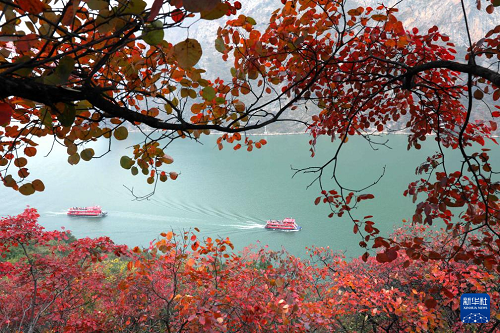 12月7日,船只行駛在紅葉映襯下的長江三峽巫峽段。(新華社發(fā) 王忠虎 攝)