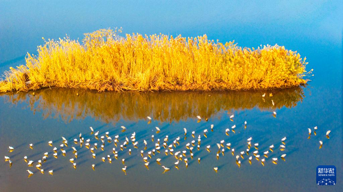 12月8日,群鳥在江蘇興化里下河國家濕地公園內(nèi)棲息、覓食(無人機照片)。(新華社發(fā) 周社根 攝)
