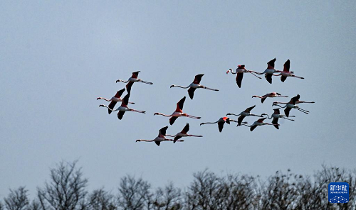 12月8日,火烈鳥在江蘇東臺條子泥濕地飛翔。(新華社發(fā) 孫家錄 攝)