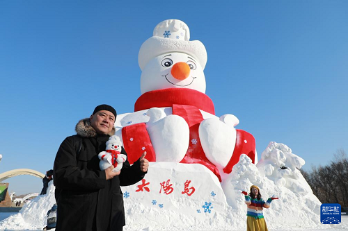 12月9日,游客在“雪人先生”前留影。(新華社發(fā) 王東 攝)