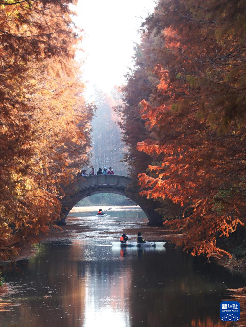 12月14日,人們?cè)谡憬幉ㄖ参飯@水杉林中揮槳戲水,樂享冬日暖陽(yáng)(無(wú)人機(jī)照片)。(新華社發(fā) 胡學(xué)軍 攝)