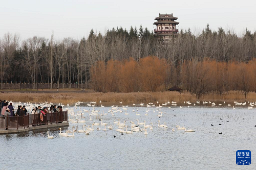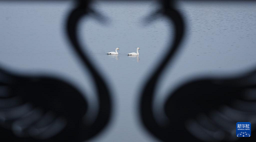 12月20日,游客在河南省三門峽市天鵝湖國(guó)家城市濕地公園觀賞天鵝。(新華社發(fā) 何五昌 攝)