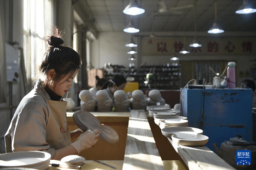 12月25日,工作人員在河北省曲陽縣一家定瓷生產(chǎn)企業(yè)的車間里加工定瓷產(chǎn)品。(新華社記者 魯鵬 攝)