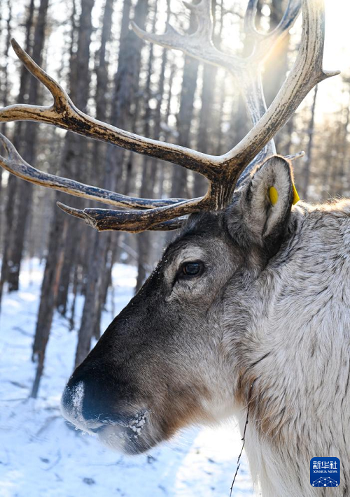 這是1月15日在根河市敖魯古雅鄂溫克民族鄉(xiāng)敖魯古雅使鹿部落景區(qū)拍攝的馴鹿。(新華社記者 徐嘉懿 攝)