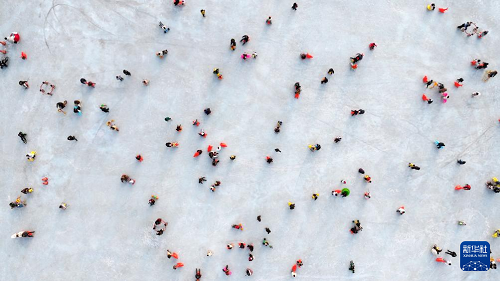 1月17日,市民在銀川文旅集團(tuán)覽山公園落日冰場游玩(無人機(jī)照片)。(新華社記者 王鵬 攝)