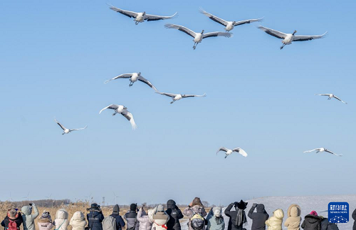 1月22日,游客在黑龍江扎龍國家級(jí)自然保護(hù)區(qū)拍攝丹頂鶴。(新華社發(fā) 何華文 攝)