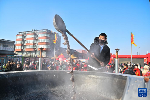 1月26日,在天津蘆臺(tái)大集,工作人員為趕集市民熬制臘八粥。(新華社記者 孫凡越 攝)