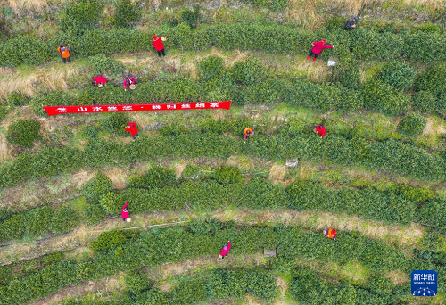 1月29日,湖北省秭歸縣郭家壩鎮(zhèn)王家?guī)X村茶農(nóng)在“絲綿茶1號”茶園采摘茶葉嫩芽(無人機照片)。(新華社發(fā) 王罡 攝)
