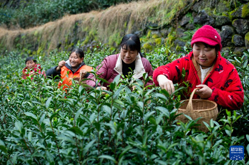 1月29日,湖北省秭歸縣郭家壩鎮(zhèn)王家?guī)X村茶農(nóng)在“絲綿茶1號”茶園采摘茶葉嫩芽。(新華社發(fā) 雷勇 攝)