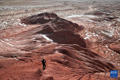 1月29日,游客在內(nèi)蒙古烏蘭察布市四子王旗紅崖臺地拍照游玩。(新華社記者 貝赫 攝)