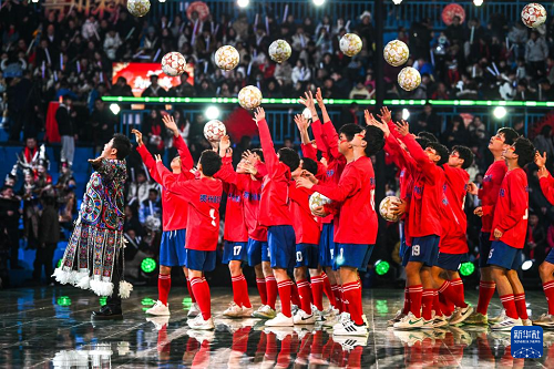 2月3日,孩子們在2026貴州“村晚”現(xiàn)場表演“村超”節(jié)目。(新華社記者 楊文斌 攝)