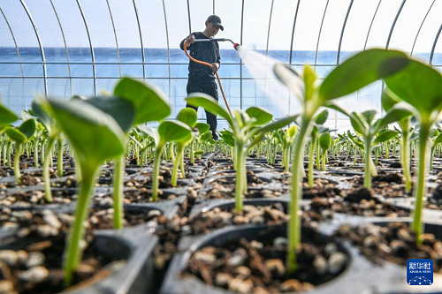 2月4日,在河南省商丘市夏邑縣曹集街道一家瓜果育苗基地,村民給瓜苗澆水保墑。(新華社發(fā) 王高超 攝)
